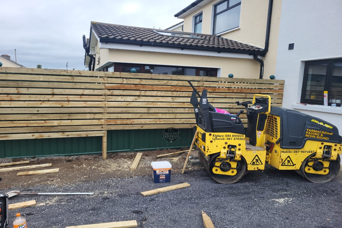 Creative Driveways installed a new patio project in Athy, Co. Kildare featuring Barleystone slabbed patio with a double charcoal paved border, stone mastic asphalt area and a concrete shed base. We also built new timber fencing with key-kerbed flowerbeds underneath it.
