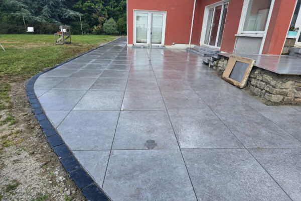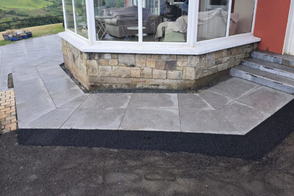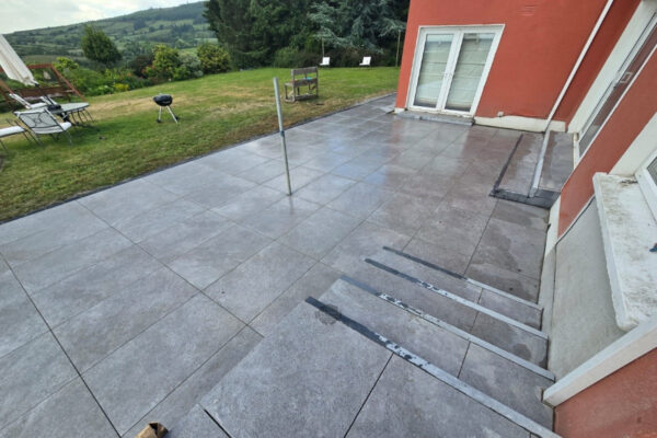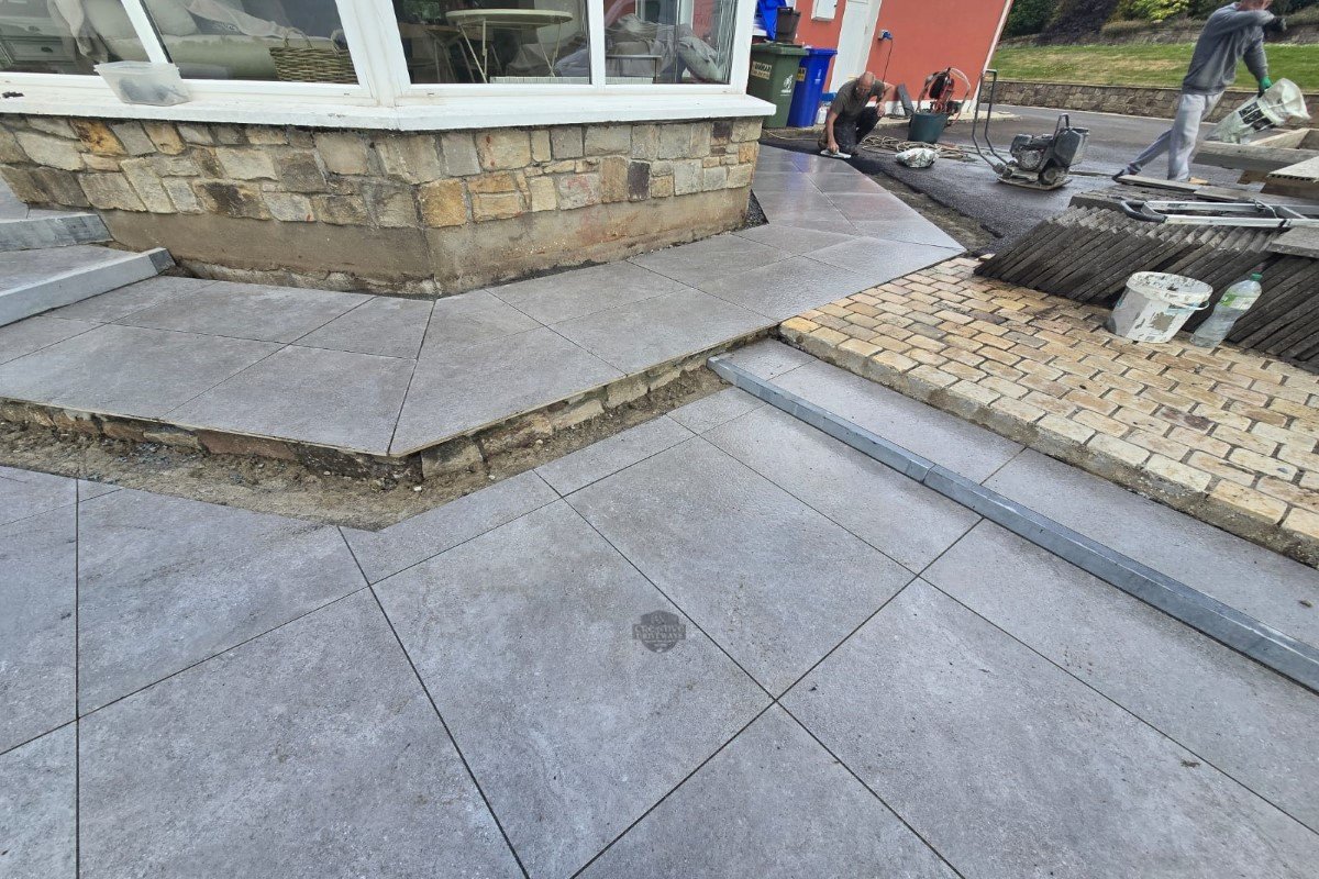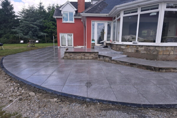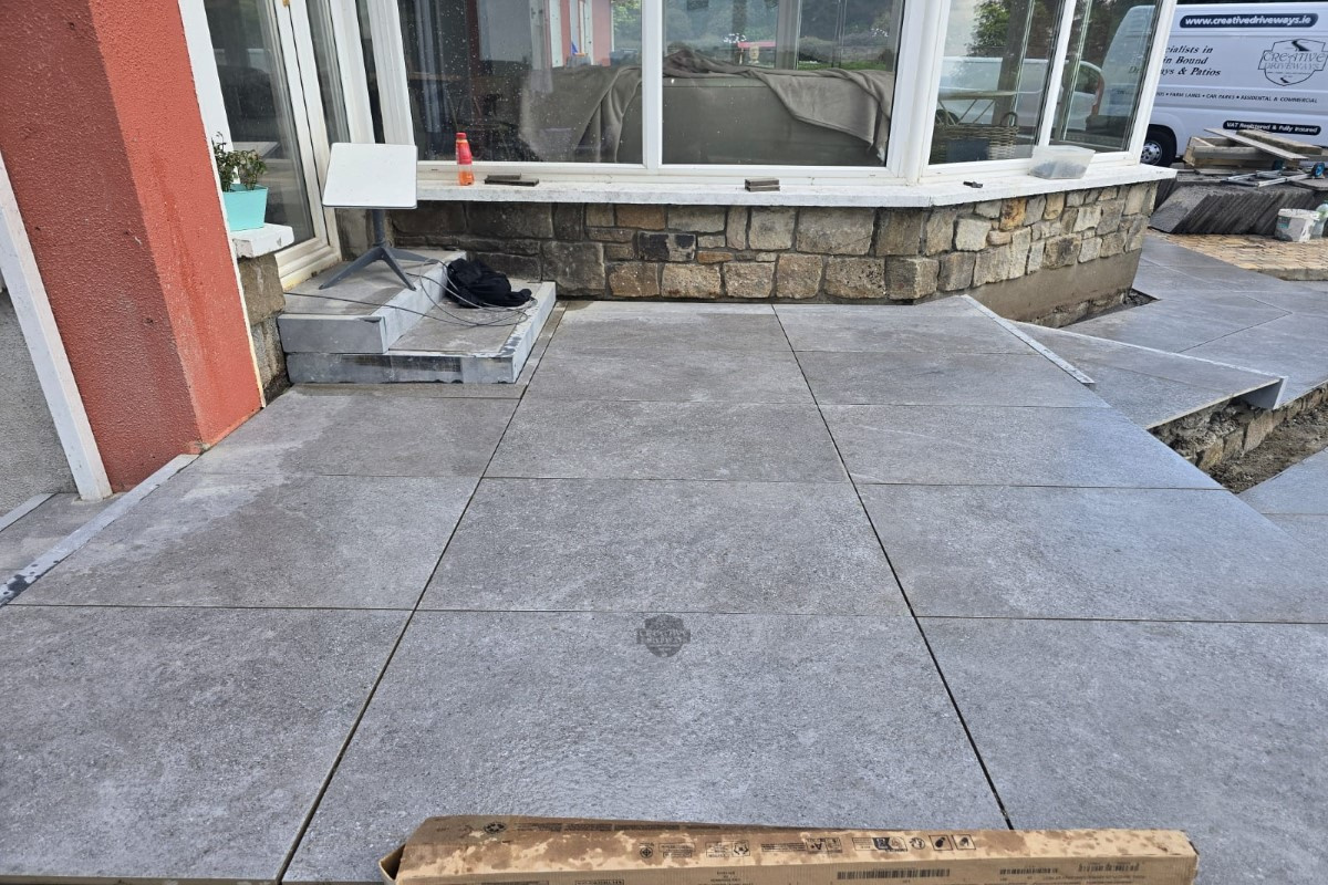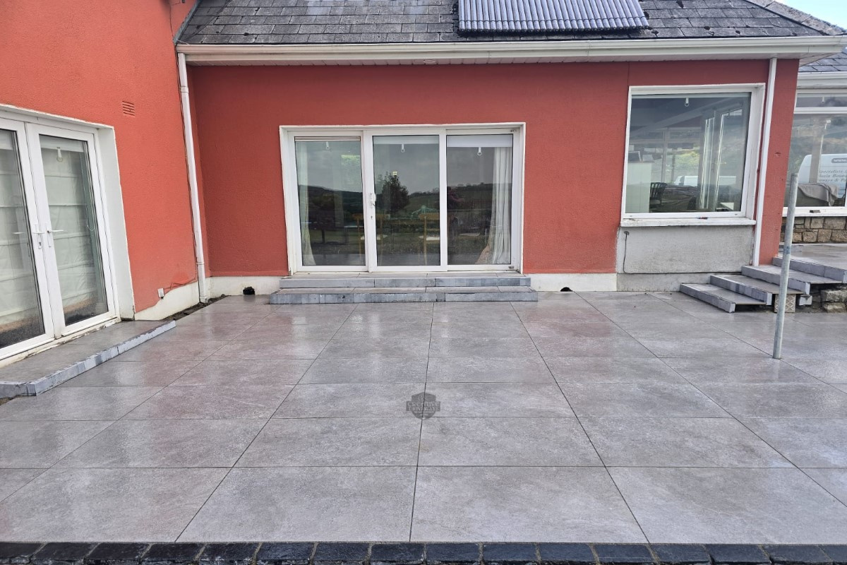This elegant patio installation in Killaloe, Co. Clare features 900x600mm porcelain tiles for a sleek, contemporary surface. The design is enhanced with handcrafted limestone steps and a matching limestone border, blending modern style with timeless natural stone detailing.
