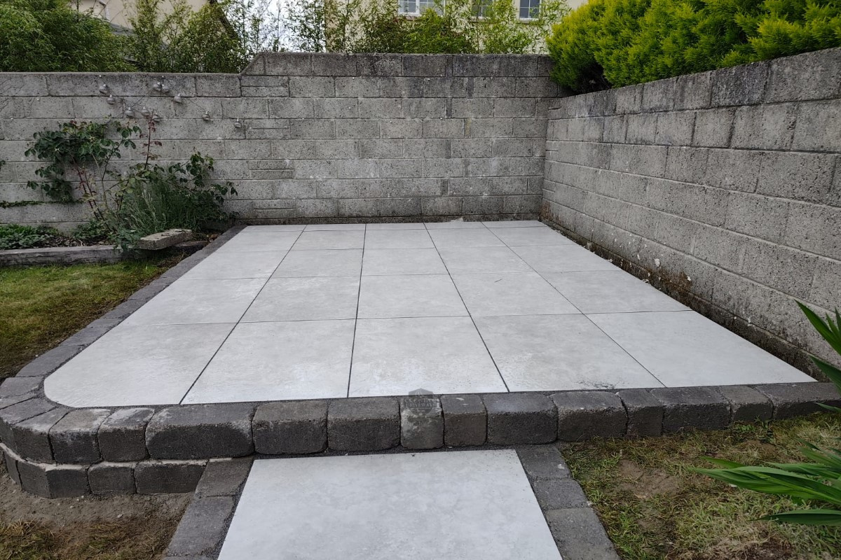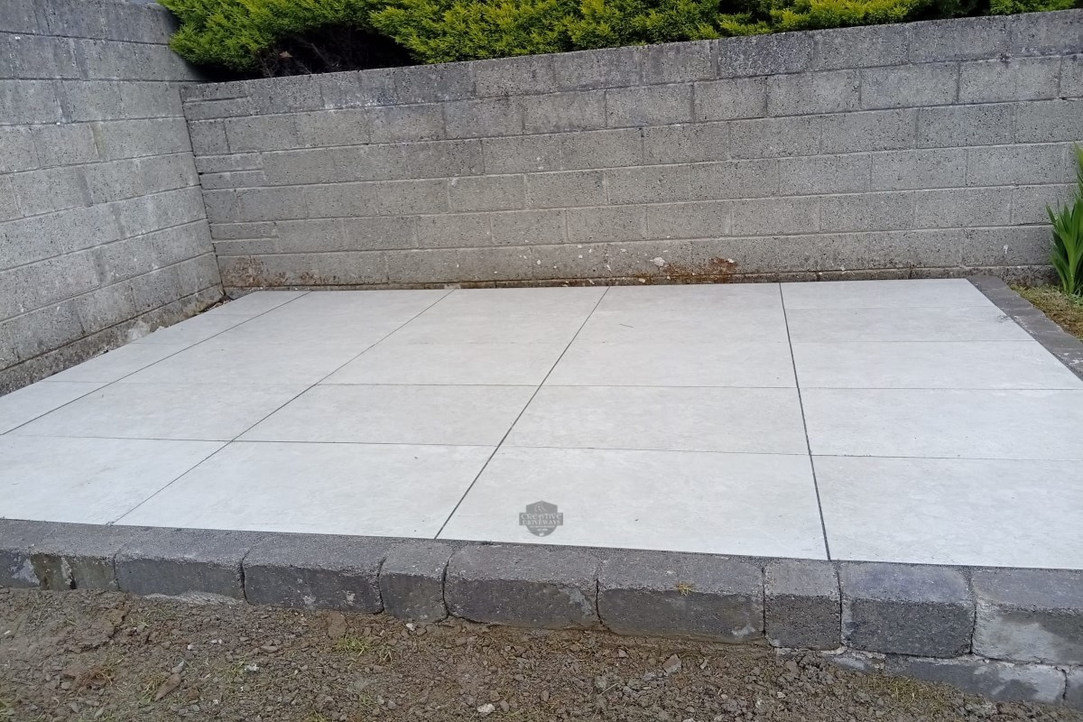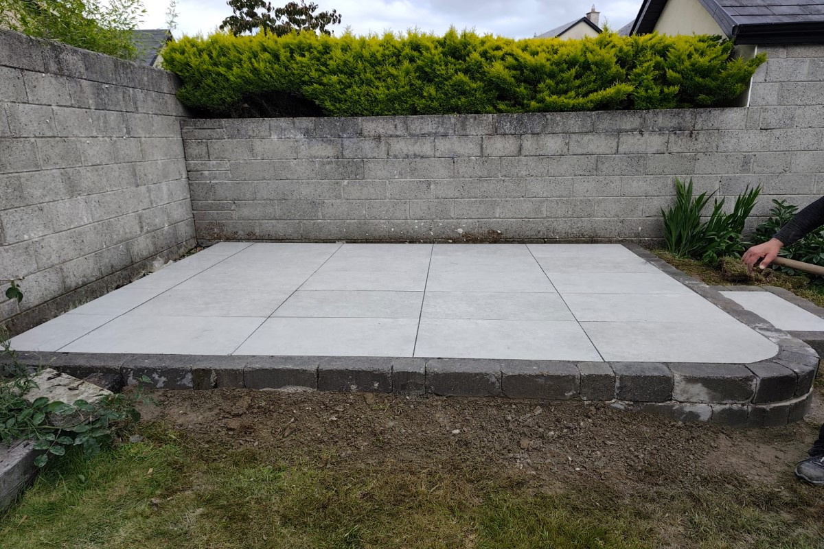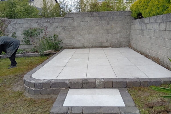 This elegant raised patio installation in Killaloe, Co. Tipperary features sleek porcelain paving paired with Barleystone Heritage walling for a refined, elevated finish. Designed for durability and style, this outdoor upgrade blends modern materials with classic stone textures.