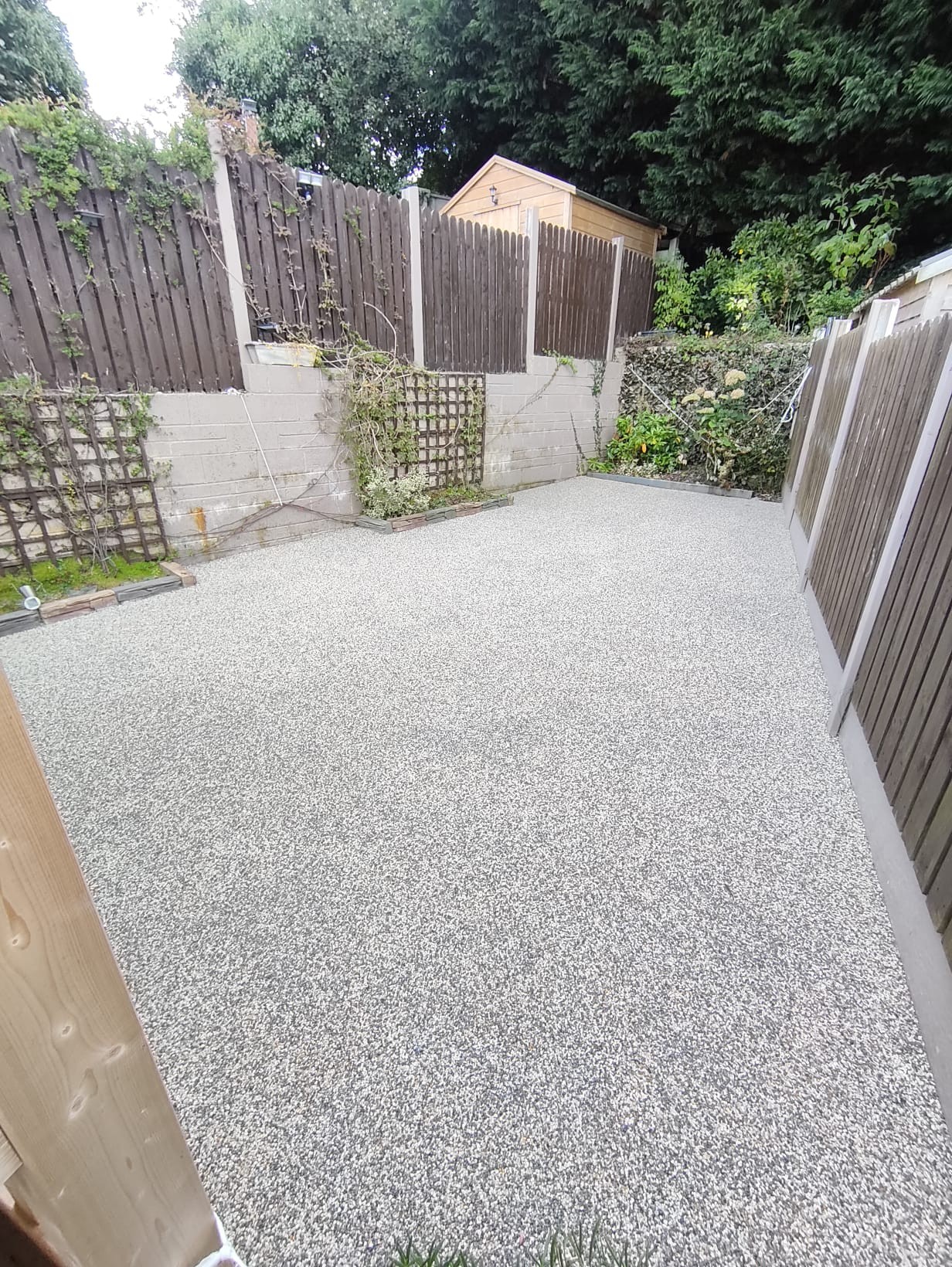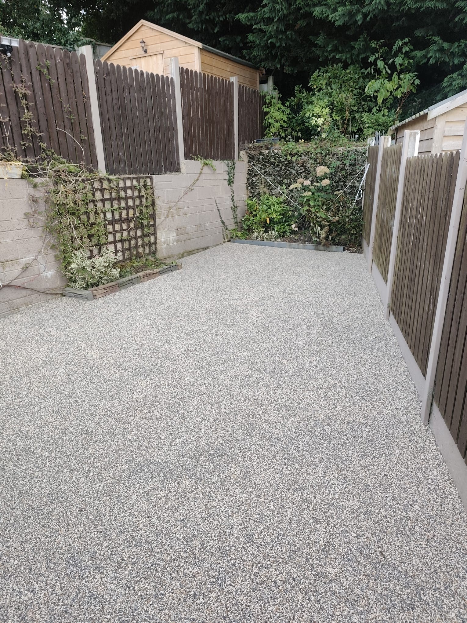 Resin bound patio installation completed in Portlaoise, Co. Laois. UV resin applied over open texture concrete base for a permeable and durable surface.