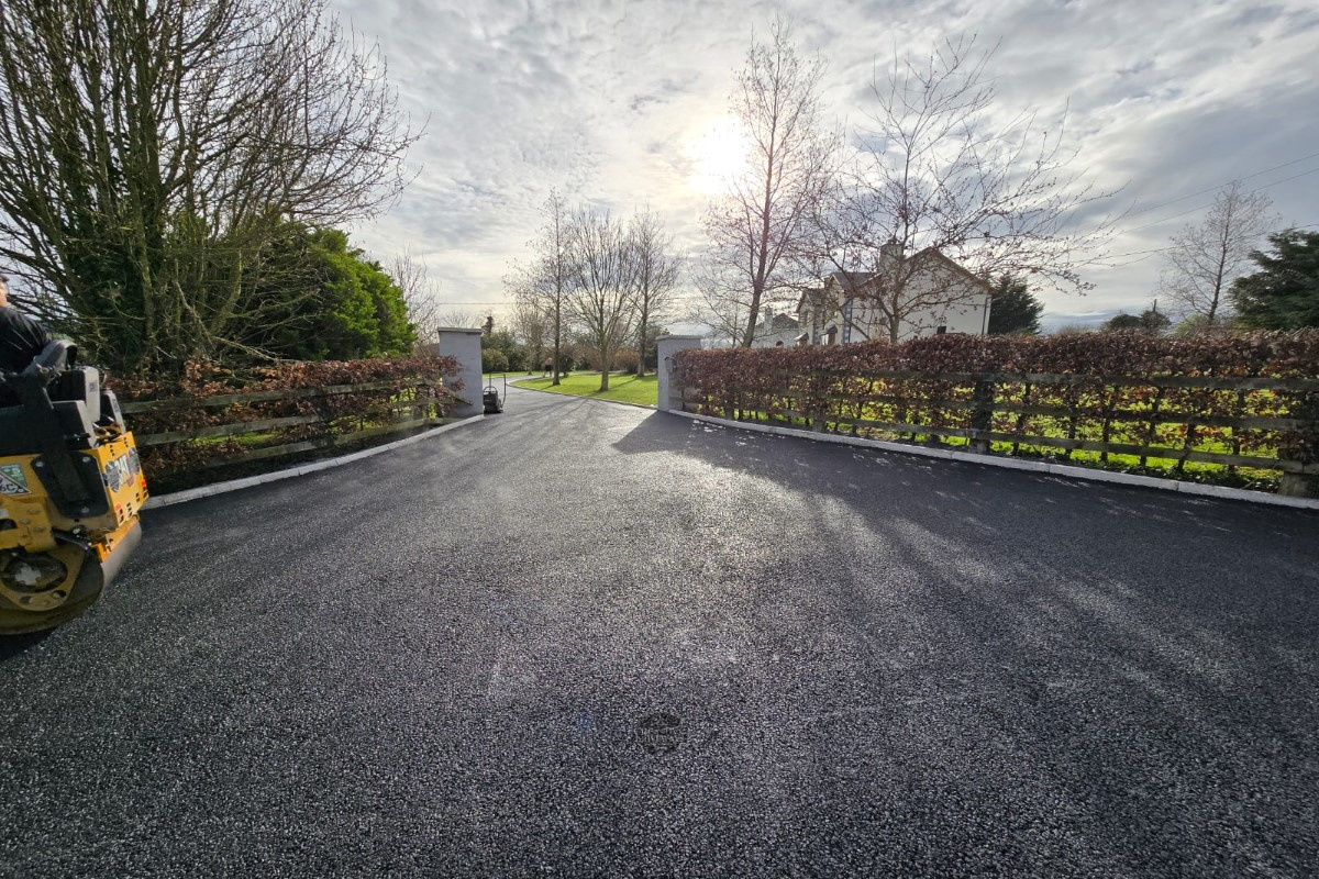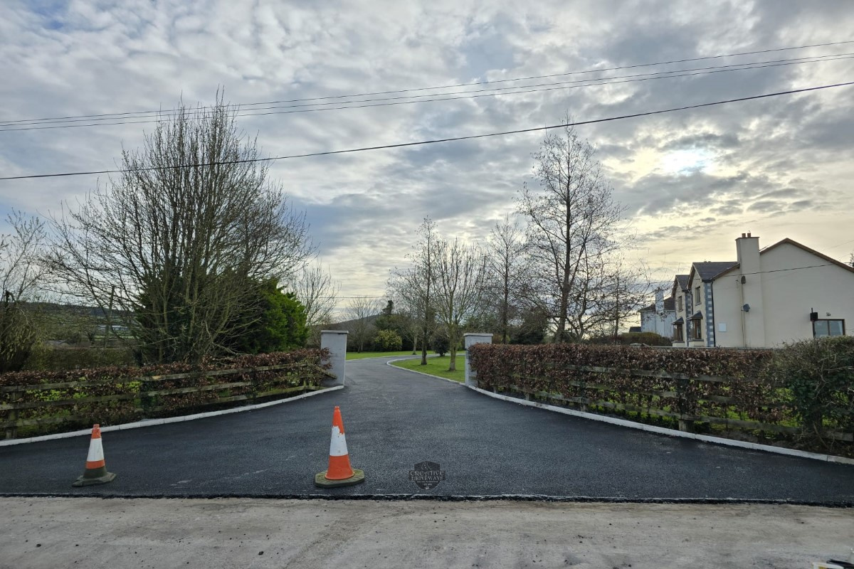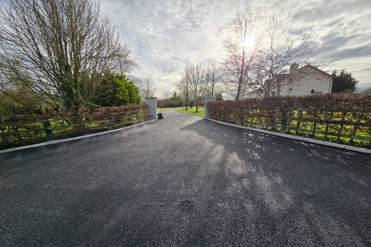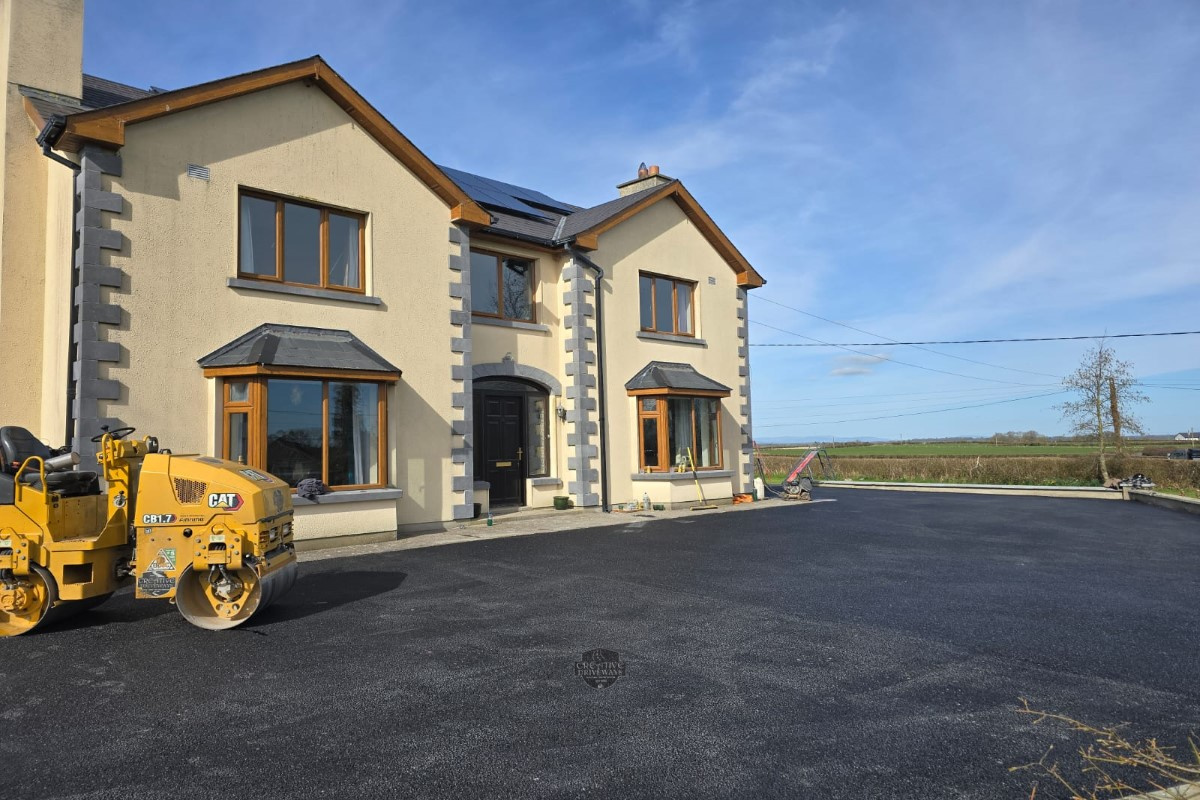 SMA driveway installed in Rathangan, Co. Kildare, featuring concrete kerbing, newly built and plastered pillars, a Barleystone paving patio, and a complete new drainage system.