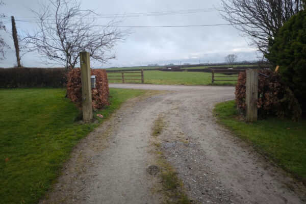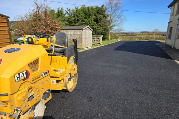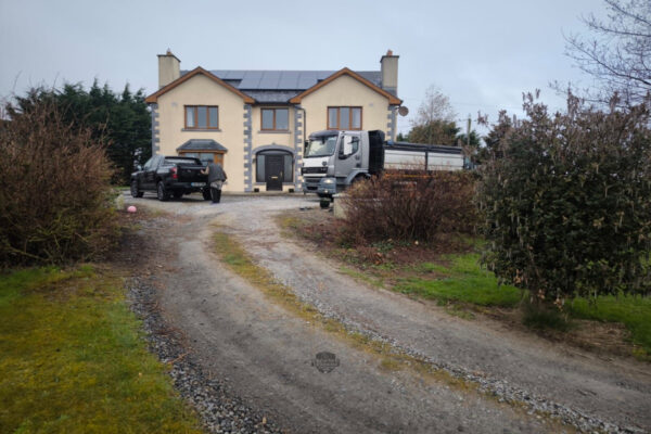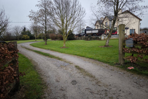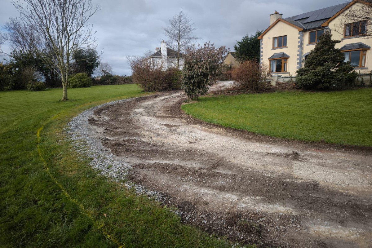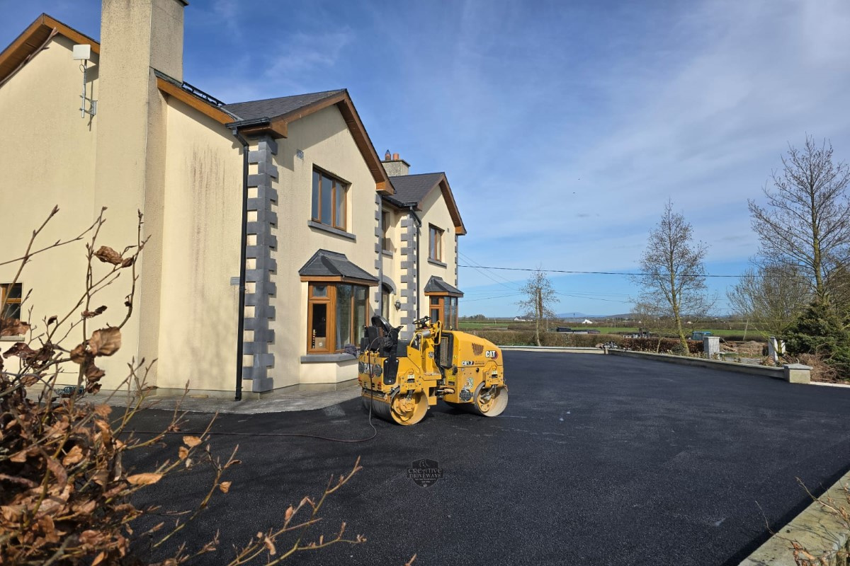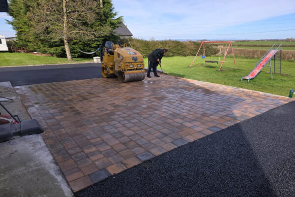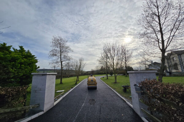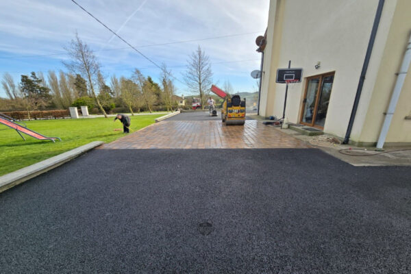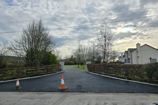SMA driveway installed in Rathangan, Co. Kildare, featuring concrete kerbing, newly built and plastered pillars, a Barleystone paving patio, and a complete new drainage system.